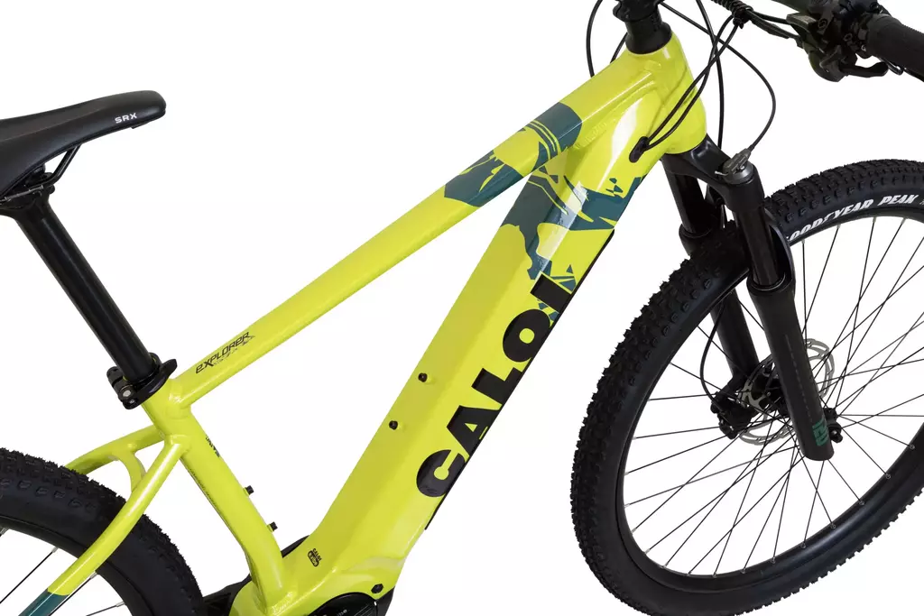 Com quadro de alumínio e desenvolvimento e fabricação brasileira, a bike traz resistência e durabilidade. O motor Caloi C75 de 75 N.m, com 250W de potência traz assistência para pedalar nas trilhas ou nas ruas, e a bateria de 36W e 504 Wh conferem um pedal contínuo. Já vem equipada também com acelerador para o ciclista que quiser descansar as pernas. Além disso, a E-Vibe Explorer vem com garfo de suspensão de 120mm de curso, câmbios, trocadores e cassete Shimano, freios hidráulicos e pneus Goodyear Peak 29 x 2.25, ou seja, uma máquina bem equipada para desbravar novos caminhos.
